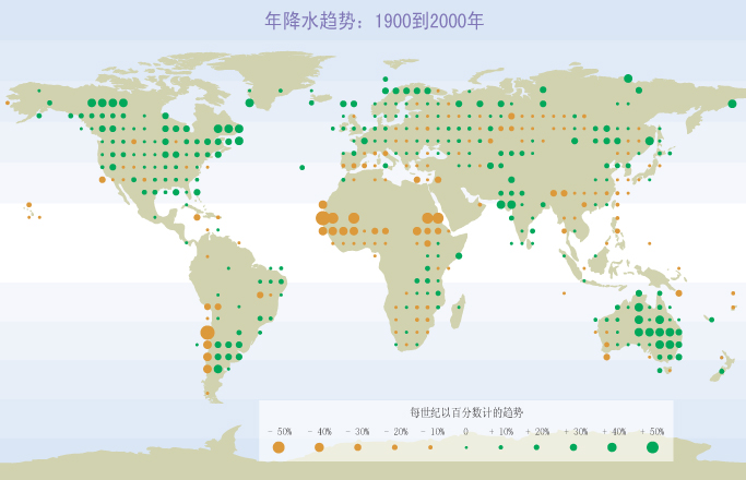 尽管记录显示所有增加与温度升高和大气湿度增大一致,各个地区之间降水变化趋势差异很大,同时这种趋势仅在一些大陆地区的20世纪才可获得。在这个时期内,经历严重干旱或水涝的陆地地区存在较小的长期趋势,但在许多地区这些变化决定于年代际或多年代际的气候变率,20世纪的趋势不显著。