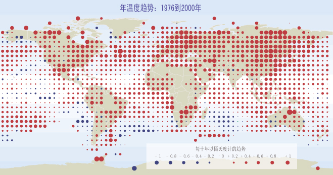 图2-6b: 20世纪的最后25年,陆地和海洋发生了持续的、大范围的变暖,温度增加在北美、欧洲和亚洲的中高纬地区最大。大范围变冷只发生在太平洋﹑南大洋和南极的部分地区。