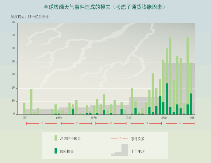 到20世纪90年代,这些损失中被保险部分的比例从过去可忽略的水平上升到23%。小的非灾难性天气相关事件(这里不包括)造成的总的损失比较小。在20世纪后半段,与天气相关的损失有一部分被归结于社会经济因素(如人口的增加、增长的财富和脆弱地带的城市化等),但部分也被归结于区域气候因子(如降水变化和洪水事件)。