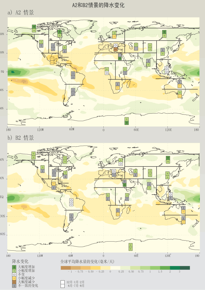 图3-3:图中表明了(a)SRES中的A2情景和(b)SRES中的B2情景的年平均降水量变化(彩色部分)。两个SRES情景应用AOGCM模拟表明了与1961~1990年相比的2071~2100年的变化结果。这里仅表示了A2和B2两种情景,因为其他的情景没有配套的AOGCM模拟模型。方框对模式之间的区域降水变化的一致性进行了分析。区域划分的主要依据为:平均一致增加高于20%(大量增加),平均一致增加高于5~20%(少量增加),变化在-5%~5%或平均变化在-5%~5%之间(没有变化),平均一致下降在-5%~-20%(少量下降),平均一致下降多于-20%(大量减少),或结论不一(无一致迹象)。九个模式中必须至少有七个结论一致才能被作为依据。