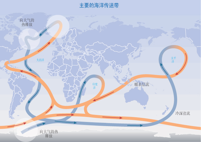 图4-2: 世界海洋中的全球环流系统示意图。全球环流系统由各大海盆中主要的南-北温盐环流路径与大西洋的绕极环流汇合而构成。暖的表层流和冷的深层流在大西洋和环南极洲(蓝色)的一些高纬深水区相连接,正是在这些地区出现海洋和大气间的主要热交换。该洋流系统对热传输及其再分布起到了实质性的作用(如北大西洋中的向极流使得西北欧洲变暖高达10°C)。模式模拟指出,该环流系统的北大西洋分支对于大气温度和水循环的变化特别脆弱。由全球变暖带来的这些不稳定性,可以破坏这个对区域-半球气候具有强烈影响的环流系统。注意这是一个示意图,它并不能指示来自部分THC的水流的确切位置。
