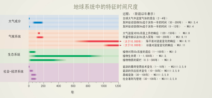 图5-1: 地球系统中一些关键过程的特征时间尺度:大气成分(蓝色)、气候系统(红色)、生态系统(绿色)和社会-经济系统(紫色)。
