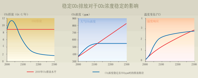 图5-3: 将CO2排放稳定在现有水平时,会引起大气CO2浓度和温度持续升高。大气CO2浓度和温度变化的稳定最终要求排放降低到目前水平之下。在所有3组线中,红线表示的是将排放稳定在WRE550情景所限定的2000年排放水平上的结果(比2000年的实际排放稍高一些),蓝线是WRE550稳定情景下的排放结果。两种个例只表明:在短期内全球的稳定排放是无法达到的,没有表明WRE550会是比其他情景更好的选择。其他的稳定情景见图6-1。图5-3是构建在《第三次评估报告》第一工作组部分第3和第9章描述的模式上。
