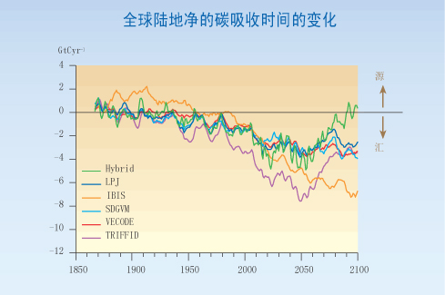 和氮的增肥效应以及一些气候变化(例如高纬度较长的生长季)。许多模式(由组中首字母表示)预计,在几十年内净碳吸收的强度将继续增加,在21世纪后期的几年内保持稳定或下降,具体原因如同文字部分。此处引用的模式结果是基于IS92a情景,实际上其他情景的模拟也得到相似的结论。