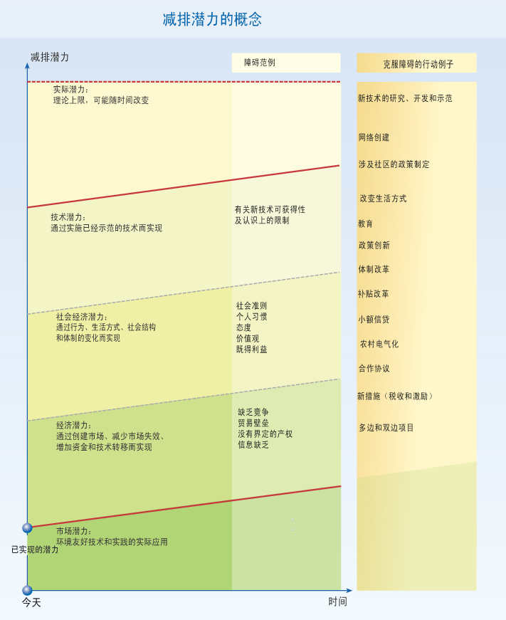 各种障碍阻挠不同潜力的实现。克服障碍的机会存在于创新项目、计划和资金安排之中。一项活动可以针对一个以上的障碍。可以推行同时针对所有层次的障碍的活动。它们的实施需要公共政策、措施和手段的配套。在经济和技术潜力之间的任何地方都可能有社会-经济潜力。