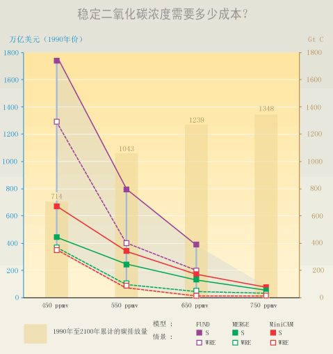 浓度稳定在450~750ppmv时的成本(按1990年美元价,1990到2100年贴现率为5%的贴现值)进行了计算。