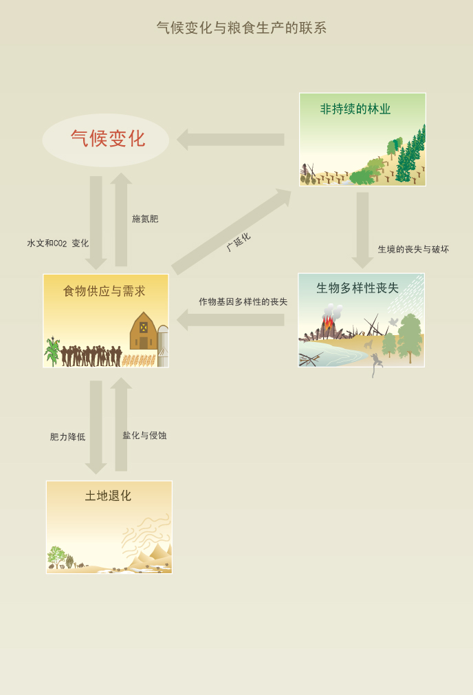 图8-2: 该图显示出气候变化和其他环境因子在粮食供应和需求上的联系。由于世界人口的增长,不断增加的粮食需求,需要生产更多的粮食。而这反过来又带来一系列与土地利用有关的问题,如将荒地改良为农田(粗放);使用化肥和/或利用灌溉增加产量(集约化),或开发其他的不可利用的土地。由于生态系统转变为仅生长少数物种(通常为外来植物)的农田,耕地扩大导致生物多样性的减少。因为森林被牧地或农田取代,森林转变为农田相对于大气引起碳的净损失。由于农业系统的保水能力低于森林,森林砍伐将增加洪水发生的可能性。集约化的作物生产包括一系列化学措施,而这些措施大部分是施用氮肥,导致释放含氮化合物(其中有些是很强的温室气体)到大气中和含氮径流至流域的副作用,带来许多环境和健康问题。灌溉的扩张影响其他用途的淡水供应,导致水使用权的不足和纠纷。满足增加了的农业生产的需要都会潜在地增加全球生物多样性损失的速率、气候变化和荒漠化。特别地,还存在水是构成所有这些问题的基础的相互关系,但为简单计未在图中示出。