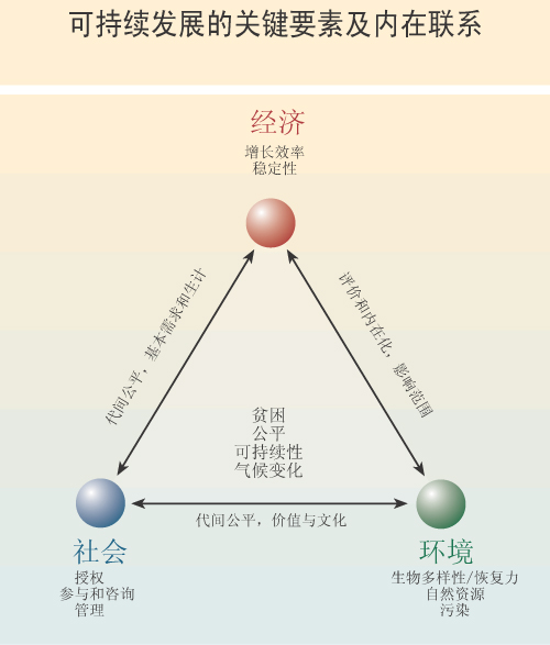 经济领域重点适用于增进人类福利,主要通过增加货物和服务的消费。环境领域集中于保护生态系统的完整性和可恢复性。社会领域强调加强人类联系及个人和群体意愿的实现。三个领域之间联系的例子显示在三角形的边上。重要的议题,如气候变化、贫困、公平性、可持续性位于三角形之内,与所有三个领域相互作用。