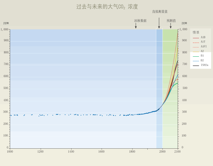 图9-1a: 根据冰核和积雪数据,并辅以过去几十年中从大气直接采样的数据而得到的1000年到2000年的大气CO