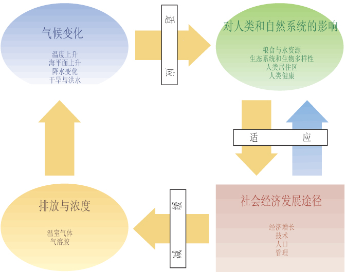 上图是关于人为气候变化的一种综合评估框架的示意简图。黄色箭头表示图中所示四个象限之间的因果循环,而蓝色箭头表示对气候变化影响的社会响应。参见(