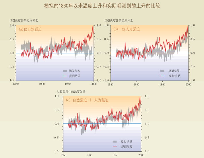 图SPM-2: 模拟地球的温度变化(°C),并将模拟结果与观测的变化进行比较,可以帮助了解主要变化的原因。气候模式可以用来模拟源自自然和人为因子的温度变化。(a)中灰色带所代表的模拟值是仅用自然因子强迫的结果,即只考虑了太阳变化和火山活动。(b)中灰色带所代表的模拟值是用人为强迫因子得到的,即考虑了温室气体和硫酸盐气溶胶。(c)中灰色带所代表的模拟值则是既考虑自然因子,也考虑人为因子的出的变化。从(b)可见,加入人为强迫后可以初步解释过去一个世纪温度变化的主要部分,但模拟和观测值最接近的结果来自于(c),因为此时自然和人为影响因子都考虑了。这些结果说明,所包括的强迫因子对于解释观测到的变化是充分的,但这并不排除其他强迫可能也起作用的可能性。