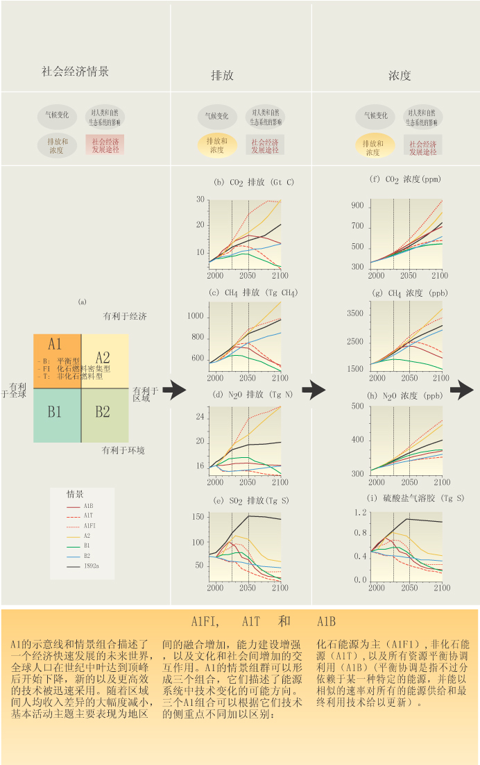 图SPM-3:SRES情景下,不同的社会经济假设会导致未来不同的温室气体和气溶胶的排放水平。排放又会反过来影响大气中这些温室气体和气溶胶的浓度,导致气候系统中辐射强迫的变化。由SRES情景而造成的辐射强迫所导致的预计的温度和海平面升高,又将会造成反馈性影响。SRES情景中没有包括额外的气候行动计划,也认为不存在这样的可能。由于SRES情景是在第三次评估报告前非常短的时间内完成的,这里所提到的影响评价大多应用的是基于平衡气候变化情景下的气候模型结果(例如2xCO2),相对较少的应用了CO2以每年1%递增的渐进情景或第二次评估报告中的情景(例如 IS92系列)。气候影响相应地也会影响到社会经济的发展道路,如通过适应或减缓措施。图表上端的亮度加重部分表明,在考虑气候变化时,各个方面是如何和整体评估框架相联系的。(见图SPM-1)。