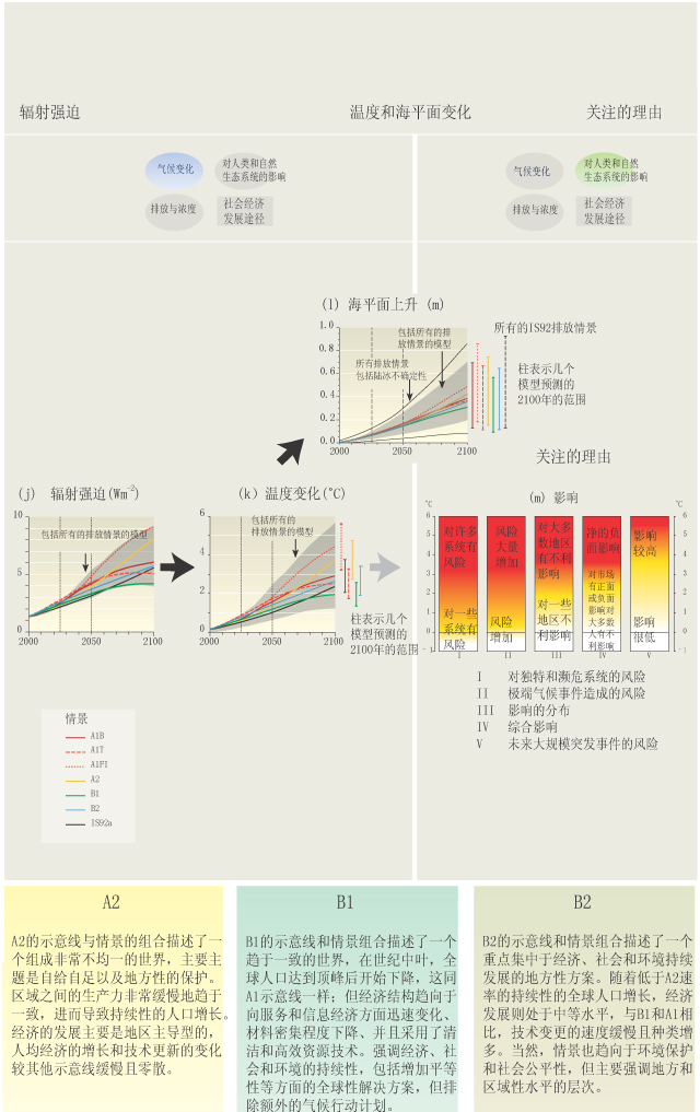 图SPM-3: SRES情景下,不同的社会经济假设会导致未来不同的温室气体和气溶胶的排放水平。排放又会反过来影响大气中这些温室气体和气溶胶的浓度,导致气候系统中辐射强迫的变化。由SRES情景而造成的辐射强迫所导致的预计的温度和海平面升高,又将会造成反馈性影响。SRES情景中没有包括额外的气候行动计划,也认为不存在这样的可能。由于SRES情景是在第三次评估报告前非常短的时间内完成的,这里所提到的影响评价大多应用的是基于平衡气候变化情景下的气候模型结果(例如2xCO2),相对较少的应用了CO2以每年1%递增的渐进情景或第二次评估报告中的情景(例如 IS92系列)。气候影响相应地也会影响到社会经济的发展道路,如通过适应或减缓措施。图表上端的亮度加重部分表明,在考虑气候变化时,各个方面是如何和整体评估框架相联系的。(见图SPM-1)。