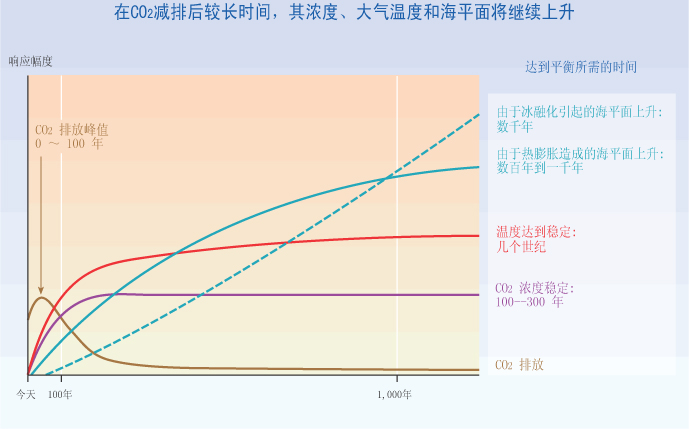 排减后,海洋的热膨胀也将持续很长一段时间,同样在数百年内冰原的融化会继续对海平面上升产生影响。本图只是对稳定在450-1000ppm间的任一水平的一般性描述,因此在相应的坐标轴上没有标注单位。在这个范围内对稳定轨迹的响应表明非常相似的时间进程,然而在CO