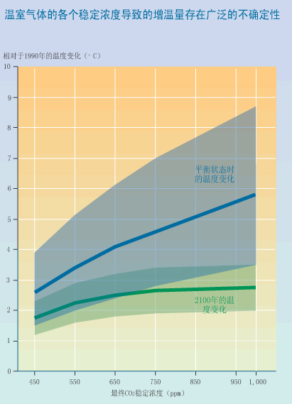 图SPM-7: 稳定CO2浓度可以减缓增温,但存在不同程度的不确定性。利用简单气候模型预测了图SPM-6中所示的WRE情景(a)2100和(b)长期平衡状态下相对于1990年的温度增加情况。对不同的温室气体稳定浓度水平的最低与最高估计时假设气候敏感性分别为1.7°C和4.2°C。中间的线为最高值和最低值的平均。