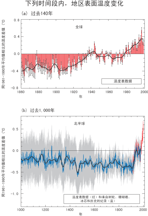 (b) 此外,根据代用资料已建起在过去1000年间北半球平均表面温度的逐年变化(蓝线)和50年平均变化(黑线),这些代用资料按温度表数据进行标定(见图中主要代用资料清单)。灰色区域代表每年资料的95%信度区间。由于使用相对分散的代用资料,较为遥远的年代里这些不确定性将增加,而且通常比器测记录大很多。然而,20世纪变暖的速度和时间与过去1000年的其他9个世纪相比要大得多。同样,20世纪90年代可能是过去千年中最热的十年,1998年可能是7最热的一年。