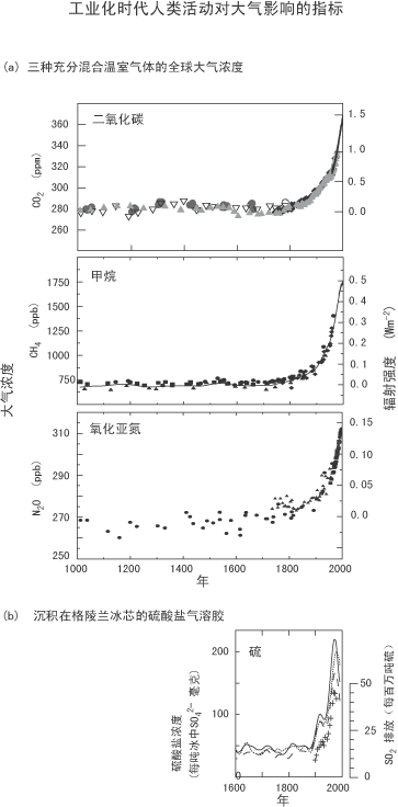 (a) 表明大气中二氧化碳(CO2)、甲烷(CH4)和氧化亚氮(N2O)在过去1000年的变化。来自南极和格陵兰几个地点的冰芯和粒雪资料(由不同的符号表示)因过去几十所大气直接采样样品资料,(CO2)曲线所示,同时为代表全球平均甲烷曲线所并入)得到补充。这些气体对气候系统所估计的正辐射强迫在右边坐标给出。由于这些气体在大气中都有十年或更长的生命期,而且混合得很好,其浓度将可以反映全球源的排放。三个记录均表明,在工业化时代人类排放的巨大和不断增长的影响。