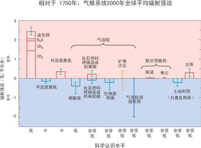图3: 许多外部因子影响气候变化。这些辐射强迫来自大气成分的变化,土地使用造成的地表面反射率的变化和太阳输出的变化。除太阳变化以外,其余均与某种人类活动有关。矩形代表这些强迫的贡献率,有些会产生增温,有些会产生降温。火山爆发产生的强迫是负强迫,只会持续几年,此处未列入。给出的气溶胶的非直接影响是它们对云滴大小和数量的影响。气溶胶对云的第二个非直接影响,即对云的生命期的影响,这也产生负强迫,这里未给出。航空对温室气体的影响已包括在每一矩形。矩形上的线表示估计的范围,这是根据已出版的强迫值和物理理解水平得到的。一些强迫比其它的确定性高得多。不带矩形的竖线表示由于不确定性较大无法给出最佳估计的强迫。对每一强迫的总体科学理解程度如所注释差别甚大。有些辐射强迫的因子,破坏全球热平衡,在全球充分混合,如CO2。其他的则是由于空间分布的原因有很强区域特点的扰动,如气溶胶。由于这样或那样的原因,将正负值简单相加无法得出对气候系统的净影响。本评估报告的模拟(如图5)显示,这些扰动的净影响使全球气候自1750年以来变暖。[根据 第六章,图6.6]