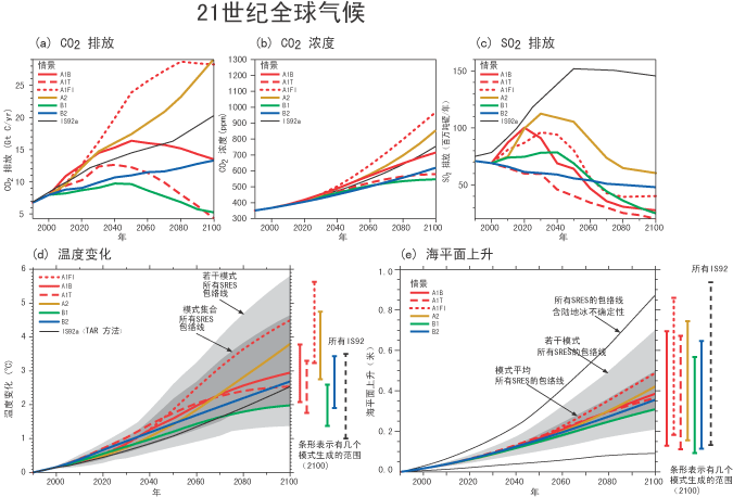 气候模式可以预测诸如全球地表温度和海平面上升等许多气候变量对各类温室气体及其它人为排放情景的响应。图(a)表示6个说明性的SRES情景下CO2排放。方框内文字解释了这些情景。同时表示的还有IS92a,以便与SAR比较。图(b)表明所预测的CO2浓度。图(C)给出了人为SO2的排放。其他气体和气溶胶排放也包括在模式里,但图中未表示。图(d)和(e)分别表明了所预测的温度和海平面响应。图(d)和(e)中“若干模式所有SRES包络线”分别表示用简单模式得到的温度和海平面上升值,但此模式已经过调试,使其得到与具备各种气候敏感性的复杂模式相同的输出。所有SRES包络线指35个SRES情景所包括的范围。“模式平均所有SRES包络线”表示在各种排放情景下所有这些模式结果的平均值。注意,从这些排放情景得出的增暖和海平面上升趋势将持续到2100年以后。也注意,这些区间没有考虑与西南极冰盖冰动力过程变化有关的不确定性,同时了没有考虑在预测非硫酸盐气溶胶和温室气体浓度方面的不确定性。