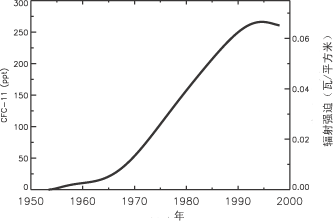 )的对流层浓度(ppt)。右侧坐标轴表示CFC-11的辐射强迫。[根据
