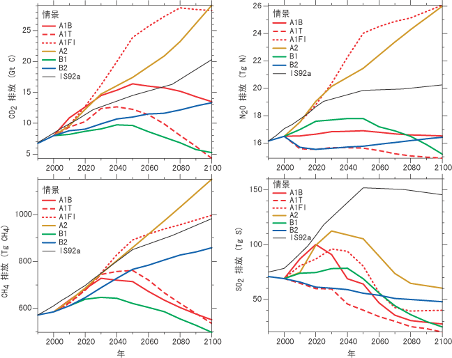 O和二氧化硫的人为排放量。为了对比,还给出了IS92a情景的结果。[根据IPCC排放情景特别报告。]