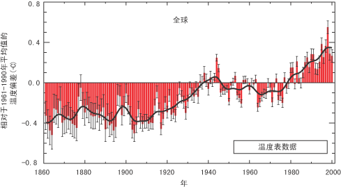 相对1961-1990年综和的1861-2000年年地表和海表温度距平(°C),在年数值上刻度指示有两个标准方差的不确定。(根据