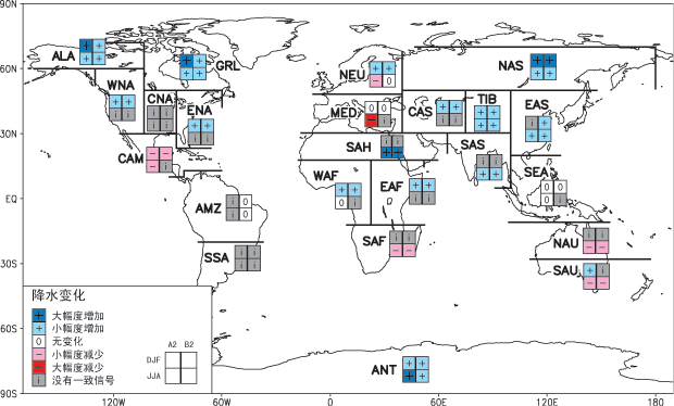 区域性降水变化的模式间一致性分析。图中所示区域划分遵照以下的原则:降水平均增加20%以上(大幅度增加);降水平均增加5%-20%(无变化);降水平均变化-5%--20%(小幅度减少);降水平均减少在20%以上(大幅度减少);或者模式模拟结果不统一(没有一致信号)。一致性定义为9个模式中至少有7个模式的模拟结果一致。[根据