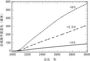 在同等的海平面高度变化情况中格陵兰冰盖的响应,这些响应是对于在第3个千年期间的三种气候变暖情景而出现的。曲线标识指的是公元3000年之前格陵兰年平均气温的增温量,这是一个两维气候和海洋模式的预测结果,该模式考虑了温室气体浓度在公元2130年之前的上升和之后维持定常的强迫。注意,对于