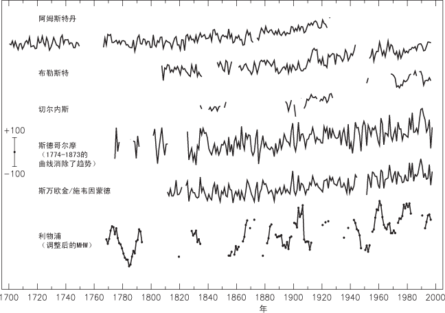 利用北欧、荷兰的阿姆斯特丹、法国的布勒斯特、英国的切尔内斯、瑞典的斯德哥尔摩(在1774-1873年的曲线消除了趋势,以去除冰后期反弹的一级贡献),波兰的斯万欧金(前德国Swinemunde)以及英国的利物浦资料。利物浦资料是“调整过的平均高水”资料而不是平均海平面资料,其中有一段间隔期(18.6年),刻度指示为 ±100 毫米。[根据