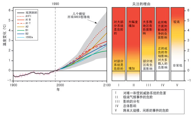 图SPM-2: 重视预计的气候变化影响的理由。气候不利影响的风险随气候变化的强度而增加。本图的左半部分显示,相对于1990年的观测温度增加和IPCC第一工作组《排放情景特别报告》中预计的温度增加幅度。图的右边概念性地显示出重视气候变化风险的5个原因。白色表明没有影响或微弱的影响,黄色表明对一些生态系统的负面影响或风险低,红色表明有大范围和/或较大强度的负面影响或风险。影响和风险的评估仅仅考虑变化的强度,而没有考虑变化的速率。图中用全球年平均温度代表气候变化的强度,但预计的影响则是全球和区域平均气候变化的强度和速率、气候变率和极端气候现象、社会和经济状况以及适应性的函数。
