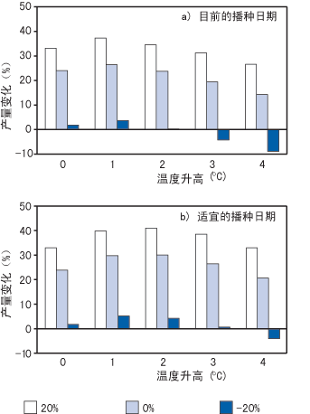 (700ppm水平下)和温度、降水量在一定范围内变化,澳大利亚小麦的年平均总产量的变化百分率:a)目前的播种期,b)优化的播种期。在温度升高0-4ºC情况下随降水量变化产量反应:+20%(白色),0(淡蓝色),-20%(深蓝色)。