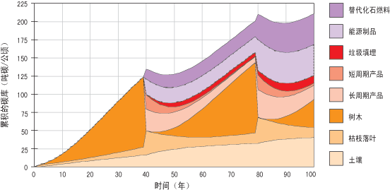注:本图显示了某情景碳累积存储量的变化,该情景涉及再造林及伐木量部分用作传统林产品,部分用作燃料。图中的数值展示了在美国南部和中部欧洲可能观察到的情形。后生树木将碳存储到森林中(假设的)。森林生长周期是每40年收获一次,部分枯枝落叶留在地上腐烂,产品用后积存起来或作为垃圾填埋。同使用化石燃料的替代情景相比或同利用更多高能耗产品来提供同样的服务的替代情景相比,在排放量上有一些净的变化,例如,图表显示,化石燃料排放减少了。