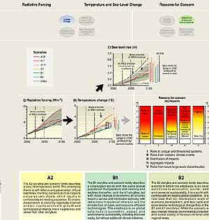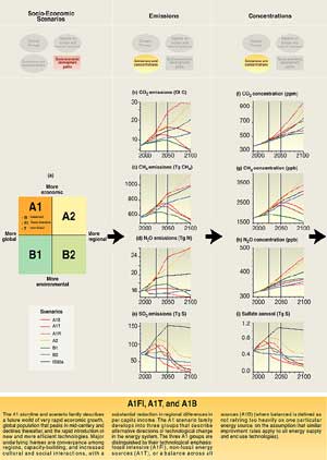| For the six illustrative SRES emissions scenarios, the projected concentration of CO2 in the year 2100 ranges from 540 to 970 ppm, compared to about 280 ppm in the pre-industrial era and about 368 ppm in the year 2000. The different socio-economic assumptions (demographic, social, economic, and technological) result in the different levels of future greenhouse gases and aerosols. Further uncertainties, especially regarding the persistence of the present removal processes (carbon sinks) and the magnitude of the climate feedback on the terrestrial biosphere, cause a variation of about -10 to +30% in the year 2100 concentration, around each scenario. Therefore, the total range is 490 to 1,260 ppm (75 to 350% above the year 1750 (pre-industrial) concentration). Concentrations of the primary non-CO2 greenhouse gases by year 2100 are projected to vary considerably across the six illustrative SRES scenarios (see Figure SPM-3). |