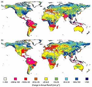 | Climate change will exacerbate water shortages in many water-scarce areas of the world. Demand for water is generally increasing due to population growth and economic development, but is falling in some countries because of increased efficiency of use. Climate change is projected to substantially reduce available water (as reflected by projected runoff) in many of the water-scarce areas of the world, but to increase it in some other areas (medium confidence) (see Figure SPM-4). Freshwater quality generally would be degraded by higher water temperatures (high confidence), but this may be offset in some regions by increased flows. | |||||