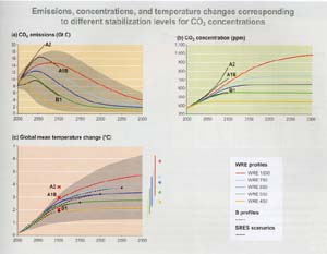 Figure 6-1: Stabilizing CO2 concentrations would require substantial reductions of emissions below current levels and would slow the rate of warming. a) CO2 emissions: The time paths of CO2 emissions that would lead to stabilization of the concentration of CO2 in the atmosphere at 450, 550, 650, 750, and 1,000 ppm are estimated for the WRE stabilization profiles using carbon cycle models. Lower CO2 concentration levels would require an earlier reversal of emissions growth and earlier decreases to levels below current emissions. The shaded area illustrates the range of uncertainty in estimating CO2 emissions corresponding to specified concentration time paths, as represented in carbon cycle models. Also shown for comparison are CO2 emissions for three of the SRES scenarios (A1B, A2, and B1), which do not include greenhouse gas emission limits. b) CO2 concentrations: The CO2 concentrations specified for the WRE profiles gradually approach stabilized levels that range from 450 to 1,000 ppm. Also shown for comparison are estimates of CO2 concentrations that would result from three of the SRES projections of emissions (A1B, A2, and B1). c) Global mean temperature changes: Global mean temperature changes are estimated for the WRE stabilization profiles using a simple climate model tuned in turn to each of several more complex models.Estimated warming slows as growth in the atmospheric concentration of CO2 slows and warming continues after the time at which the CO2 concentration is stabilized (indicated by black spots) but at a much diminished rate. It is assumed that emissions of gases other than CO2 follow the SRES A1B projection until the year 2100 and are constant thereafter.This scenario was chosen as it is in the middle of the range of the SRES scenarios. The dashed lines show the temperature changes projected for the S profiles, an alternate set of CO2 stabilization profiles (not shown in panels (a) or (b)). The shaded area illustrates the effect of a range of climate sensitivity across the five stabilization cases.The colored bars on the righthand side show, for each WRE profile, the range at the year 2300 due to the different climate model tunings and the diamonds on the righthand side show the equilibrium (very long-term) warming for each stabilization level using average climate model results. Also shown for comparison are temperature increases in the year 2100 estimated for the SRES emission scenarios (indicated by red crosses). |