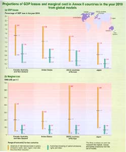 | 7.18 | The models used in the above study show that the Kyoto mechanisms are important in controlling risks of high costs in given countries, and thus could complement domestic policy mechanisms, and could minimize risks of inequitable international impacts. For example, the brown and blue lines in Figure 7-2b and Table 7-3b show that the national marginal costs to meet the Kyoto targets range from about US$20 up to US$600 per t C without Annex B trading, and range from about US$15 up to US$150 per t C with Annex B trading, respectively. At the time of these studies, most models did not include sinks, non-CO2 greenhouse gases, CDM, negative cost options, ancillary benefits, or targeted revenue recycling, which will reduce estimated costs. On the other hand, these models make assumptions which underestimate costs because they assume full use of emissions trading without transaction costs, both within and among Annex B countries, and that mitigation responses would be perfectly efficient and that economies begin to adjust to the need to meet Kyoto targets between the years 1990 and 2000. The cost reductions from Annex B trading will depend on the details of implementation, including the compatibility of domestic and international mechanisms, constraints, and transaction costs. The following is indicative of the broad variation in the change in GDP reported for Annex B countries: