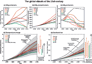 ![]() Figure 5: The global climate of the 21st century will depend on natural changes and the response of the climate system to human activities. Climate models project the response of many climate variables – such as increases in global surface temperature and sea level – to various scenarios of greenhouse gas and other human-related emissions. (a) shows the CO2 emissions of the six illustrative SRES scenarios, which are summarised in the box on page 18, along with IS92a for comparison purposes with the SAR. (b) shows projected CO2 concentrations. (c) shows anthropogenic SO2 emissions. Emissions of other gases and other aerosols were included in the model but are not shown in the figure. (d) and (e) show the projected temperature and sea level responses, respectively. The "several models all SRES envelope" in (d) and (e) shows the temperature and sea level rise, respectively, for the simple model when tuned to a number of complex models with a range of climate sensitivities. All SRES envelopes refer to the full range of 35 SRES scenarios. The "model average all SRES envelope" shows the average from these models for the range of scenarios. Note that the warming and sea level rise from these emissions would continue well beyond 2100. Also note that this range does not allow for uncertainty relating to ice dynamical changes in the West Antarctic ice sheet, nor does it account for uncertainties in projecting non-sulphate aerosols and greenhouse gas concentrations. [Based upon (a) Chapter 3, Figure 3.12, (b) Chapter 3, Figure 3.12, (c) Chapter 5, Figure 5.13, (d) Chapter 9, Figure 9.14, (e) Chapter 11, Figure 11.12, Appendix II |
