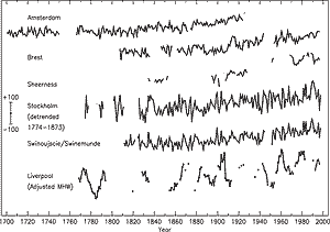 ![]() Figure 6: Time-series of relative sea level for the past 300 years from Northern Europe: Amsterdam, Netherlands; Brest, France; Sheerness, UK; Stockholm, Sweden (detrended over the period 1774 to 1873 to remove to first order the contribution of post-glacial rebound); Swinoujscie, Poland (formerly Swinemunde, Germany); and Liverpool, UK. Data for the latter are of "Adjusted Mean High Water" rather than Mean Sea Level and include a nodal (18.6 year) term. The scale bar indicates ±100 mm. [Based on Figure 11.7] |