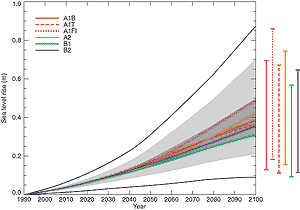 ![]() Figure 24: Global average sea level rise 1990 to 2100 for the SRES scenarios. Thermal expansion and land ice changes were calculated using a simple climate model calibrated separately for each of seven AOGCMs, and contributions from changes in permafrost, the effect of sediment deposition and the long-term adjustment of the ice sheets to past climate change were added. Each of the six lines appearing in the key is the average of AOGCMs for one of the six illustrative scenarios. The region in dark shading shows the range of the average of AOGCMs for all thirty five SRES scenarios. The region in light shading shows the range of all AOGCMs for all thirty five scenarios. The region delimited by the outermost lines shows the range of all AOGCMs and scenarios including uncertainty in land-ice changes, permafrost changes and sediment deposition. Note that this range does not allow for uncertainty relating to ice-dynamic changes in the West Antarctic ice sheet. [Based on Figure 11.12] |