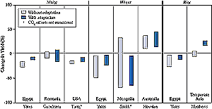 The response of crop yields to climate change varies widely, depending on the species, cultivar, soil conditions, treatment of CO2 direct effects, and other locational factors. It is established with medium confidence that a few degrees of projected warming will lead to general increases in temperate crop yields, with some regional variation (Table 5-4). At larger amounts of projected warming, most temperate crop yield responses become generally negative. Autonomous agronomic adaptation ameliorates temperate crop yield loss and improves gain in most cases (Figure TS-4). In the tropics, where some crops are near their maximum temperature tolerance and where dryland agriculture predominates, yields would decrease generally with even minimal changes in temperature; where there is a large decrease in rainfall, crop yields would be even more adversely affected (medium confidence). With autonomous agronomic adaptation, it is established with medium confidence that crop yields in the tropics tend to be less adversely affected by climate change than without adaptation, but they still tend to remain below baseline levels. Extreme events also will affect crop yields. Higher minimum temperatures will be beneficial to some crops, especially in temperate regions, and detrimental to other crops, especially in low latitudes (high confidence). Higher maximum temperatures will be generally detrimental to numerous crops (high confidence). [5.3.3]