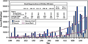 The costs of extreme weather events have exhibited a rapid upward trend in recent decades. Yearly global economic losses from large events increased from US$3.9 billion yr-1 in the 1950s to US$40 billion yr-1 in the 1990s (all 1999 US$, uncorrected for purchasing power parity). Approximately one-quarter of the losses occurred in developing countries. The insured portion of these losses rose from a negligible level to US$9.2 billion annually during the same period. Including events of all sizes doubles these loss totals (see Figure TS-5). The costs of weather events have risen rapidly, despite significant and increasing efforts at fortifying infrastructure and enhancing disaster preparedness. These efforts dampen to an unknown degree the observed rise in loss costs, although the literature attempting to separate natural from human driving forces has not quantified this effect. As a measure of increasing insurance industry vulnerability, the ratio of global property/casualty insurance premiums to weather-related losses -- an important indicator of adaptive capacity -- fell by a factor of three between 1985 and 1999. [8.3]