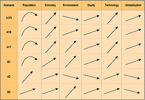 Figure TS.1: Qualitative directions of SRES scenarios for different indicators. |