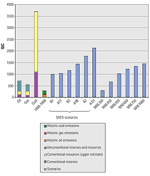 Figure TS.5: Carbon in oil, gas and coal reserves and resources compared with historic fossil fuel carbon emissions 1860-1998, and with cumulative carbon emissions from a range of SRES scenarios and TAR stabilization scenarios up until 2100. Data for reserves and resources are shown in the left hand columns. Unconventional oil and gas includes tar sands, shale oil, other heavy oil, coal bed methane, deep geopressured gas, gas in acquifers, etc. Gas hydrates (clathrates) that amount to an estimated 12,000 GtC are not shown. The scenario columns show both SRES reference scenarios as well as scenarios which lead to stabilization of CO2 concentrations at a range of levels. Note that if by 2100 cumulative emissions associated with SRES scenarios are equal to or smaller than those for stabilization scenarios, this does not imply that these scenarios equally lead to stabilization. |