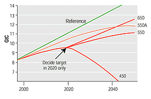 Figure TS.10a shows the results of a cost-effectiveness analysis exploring the optimal hedging strategy when uncertainty with respect to the long-term stabilization target is not resolved until 2020, suggesting that abatement over the next few years would be economically valuable if there is a significant probability of having to stay below ceilings that would be otherwise reached within the characteristic time scales of the systems producing greenhouse gases. The degree of near-term hedging in the above analysis is sensitive to the date of resolution of uncertainty, the inertia in the energy system, and the fact that the ultimate concentration target (once it has been revealed) must be met at all costs. Other experiments, such as those with cost-benefit models framed as a Bayesian decision analysis problem show that optimal near-term (next two decades) emission paths diverge only modestly under perfect foresight, and hedging even for low-probability, high-consequence scenarios (see Figure TS.10b). However, decisions about near-term climate policies may have to be made while the stabilization target is still being debated. Decision-making therefore should consider appropriate hedging against future resolution of that target and possible revision of the scientific insights in the risks of climate change. There are significant differences in the two approaches. With a cost-effectiveness analysis, the target must be made regardless of costs. With a cost-benefit analysis, costs and benefits are balanced at the margin. Nevertheless, the basic message is quite similar and involves the explicit incorporation of uncertainty and its sequential resolution over time. The desirable amount of hedging depends upon one's assessment of the stakes, the odds, and the costs of policy measures. The risk premium - the amount that society is willing to pay to reduce risk - ultimately is a political decision that differs among countries.