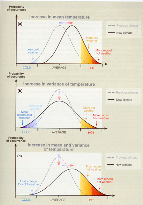 leading to more record hot weather, (b) the variance increases, and (c) when both