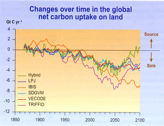 the net carbon uptake on land for several decades, then a leveling off or decline