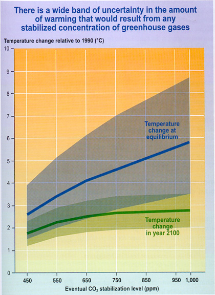 relative to 1990in (a) year 2100 and (b) at equilibrium are estimated using a