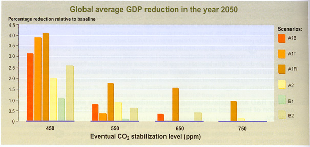 the SRES scenarios, and the stabilization level. The reduction in GDP tends
