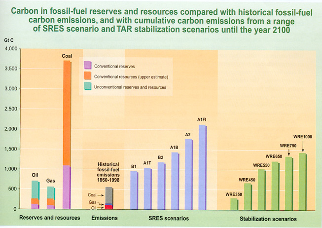 gas, and coal reserves and resources is compared with historic fossil-fuel carbon