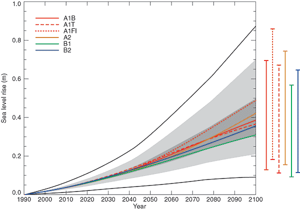 Figure 24: Global average sea level rise 1990 to 2100 for the SRES scenarios. Thermal expansion and land ice changes were calculated using a simple climate model calibrated separately for each of seven AOGCMs, and contributions from changes in permafrost, the effect of sediment deposition and the long-term adjustment of the ice sheets to past climate change were added. Each of the six lines appearing in the key is the average of AOGCMs for one of the six illustrative scenarios. The region in dark shading shows the range of the average of AOGCMs for all thirty five SRES scenarios. The region in light shading shows the range of all AOGCMs for all thirty five scenarios. The region delimited by the outermost lines shows the range of all AOGCMs and scenarios including uncertainty in land-ice changes, permafrost changes and sediment deposition. Note that this range does not allow for uncertainty relating to ice-dynamic changes in the West Antarctic ice sheet. [Based on Figure 11.12]